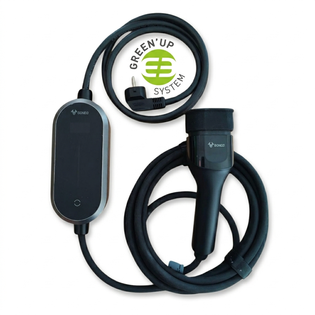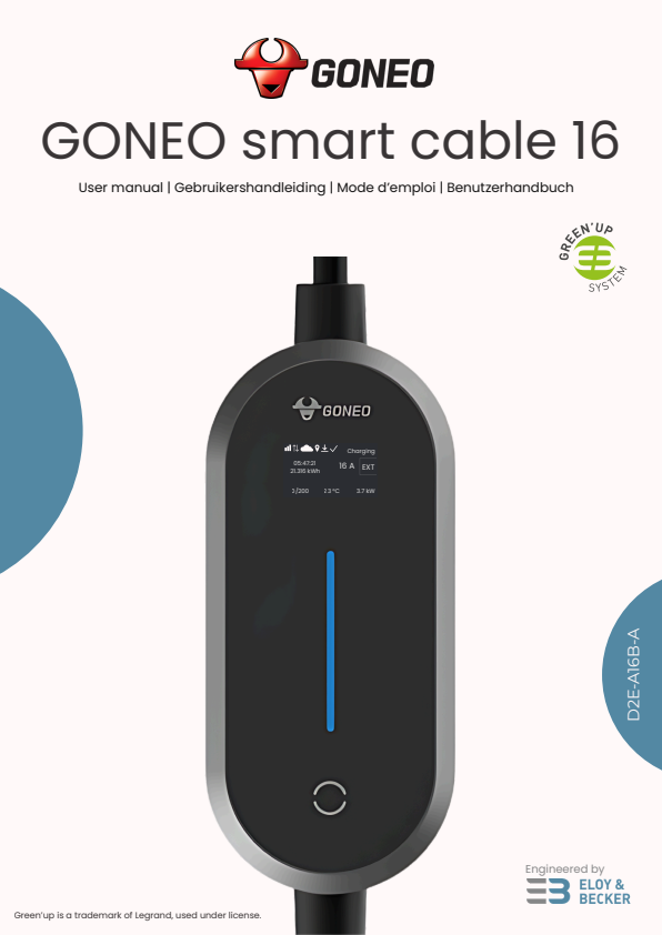 - Compatible reinforced socket (e.g. Green’up by Legrand): The Goneo Smart Cable 16 automatically detects the reinforced socket and unlocks 12A and 16A — charging up to 3.7 kW. No manual configuration needed.