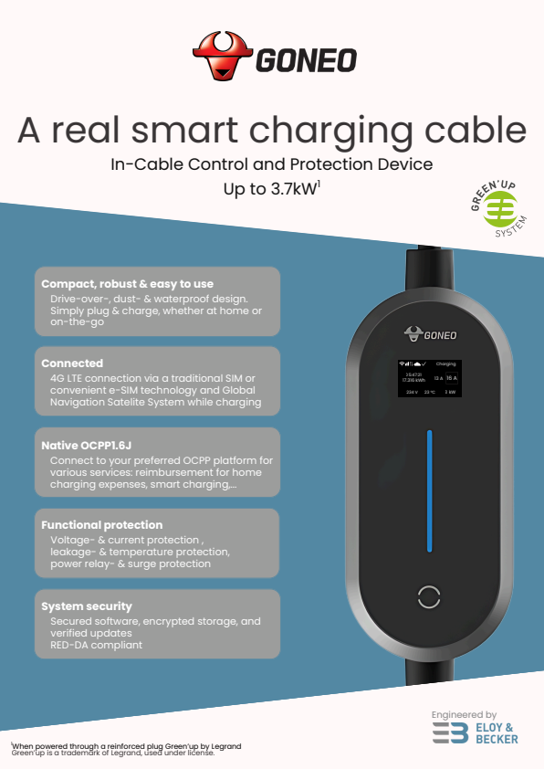 The Goneo Smart Cable 16 is a portable smart EV charging cable engineered in Belgium for drivers who want maximum flexibility without compromising on speed. As a certified In-Cable Control and Protection Device (IC-CPD) with up to 3.7 kW output, native OCPP 1.6J, 4G LTE, and automatic reinforced socket detection, it is the most powerful smart EV charging cable in the Goneo range — built for open standards and designed for everyday use.